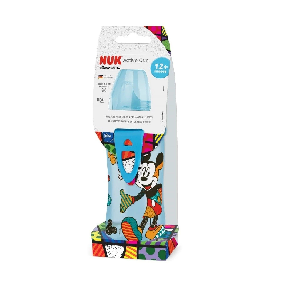 Copo Active Cup Nuk First Choice Disney possui a decoração com a alegria das cores e formas do Romero Britto unida ao mundo mágico da Disney, se encante junto com o Mickey. O produto é ideal para auxiliar as crianças na transição da mamadeira ao copo. Seu formato é ergonômico adequado para as mãozinhas das crianças, o copo é totalmente desmontável o que facilita sua limpeza. Seu bico de silicone antivazamento possui a válvula NUK Air System Anticólica que abre e fecha instantaneamente a cada sucção, reduzindo a ingestão de ar, minimiza a formação de bolhas e promove uma alimentação contínua. Recomendado para crianças a partir dos 12 meses de idade, o copo é livre de BPA e compatível com toda a linha de produtos NUK First Choice.