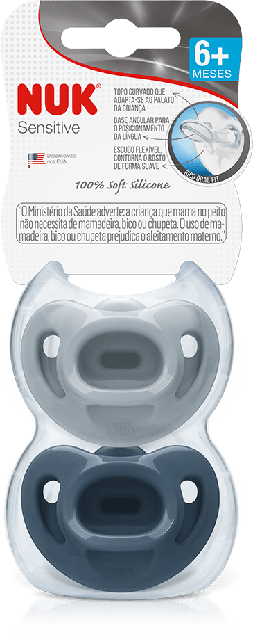 Kit com 2 Chupetas Nuk Sensitive Soft 100% Silicone que foram desenvolvidas em 100% silicone soft flex extra macio, com design moderno em peça única, alça integrada para evitar perdas e cores agradáveis. Seu formato contorna o rosto do bebê de maneira suave sem cobrir o nariz do pequeno facilitando a respiração.