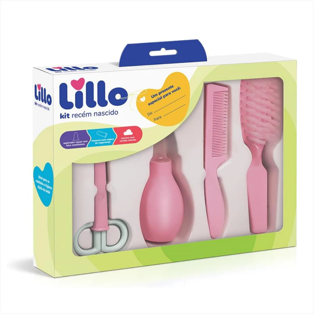 Kit de Higiene Recém Nascido Lillo é composto por aspirador nasal, tesoura com capuz protetor, pente e escova.